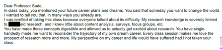 Full, anonymous, student evaluations of instruction are available upon request. Testimonials are from kind students who emailed me to communicate their appreciation. Identifying information has been redacted.